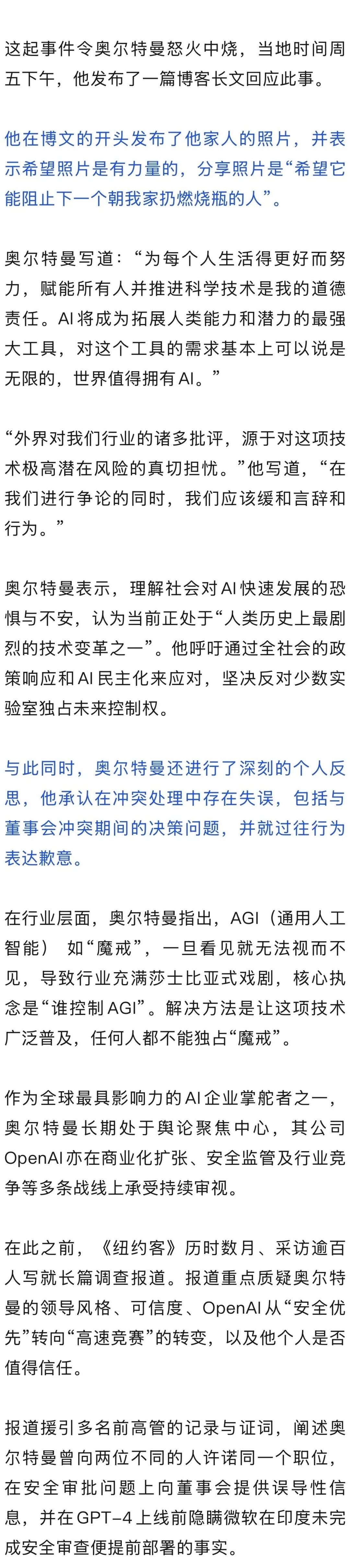 奥尔特曼称,自己在深夜惊醒后“怒火中烧”,随后陷入深刻反思。他坦言此前低估了舆论叙事的力量,承认人们对AI的恐惧和焦虑是有道理的,但“我们正在见证社会多年来,或许是有史以来最大的变革”。