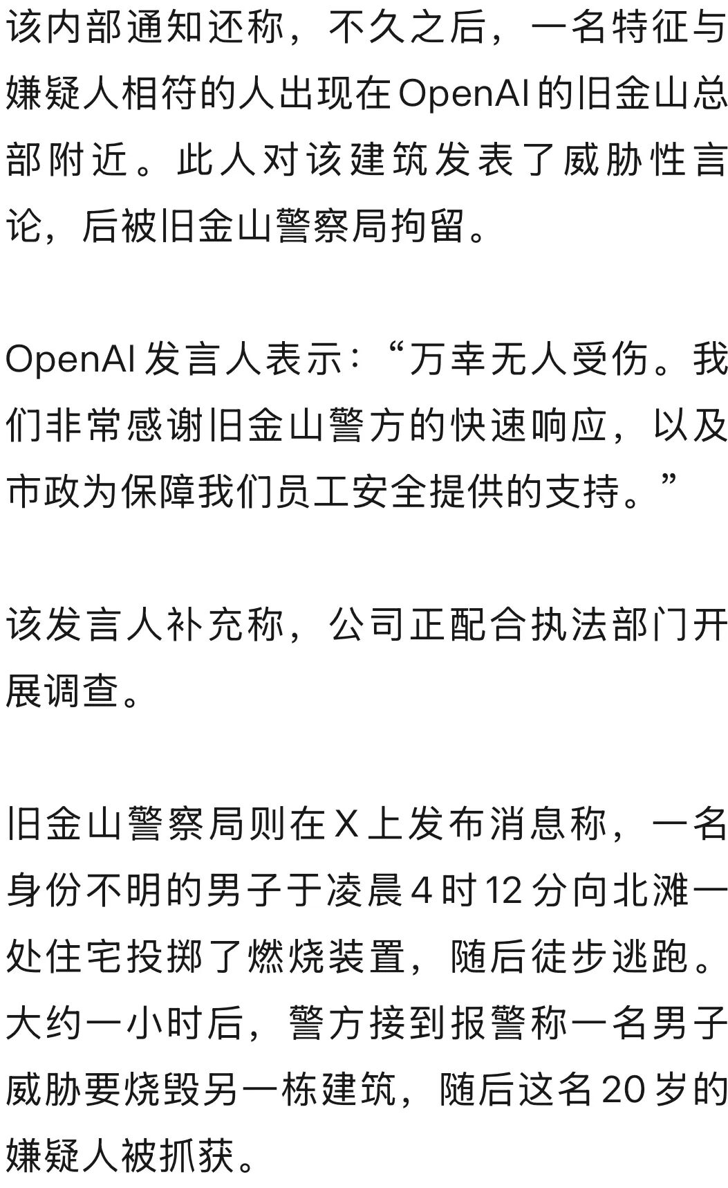 OpenAI当天表示,旧金山警方逮捕了一名涉嫌向其奥尔特曼家投掷燃烧瓶并在该AI初创公司总部外进行威胁的人。