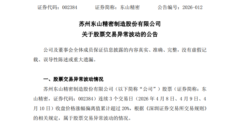 受苹果首款折叠屏手机相关消息刺激,4月8日至4月10日三个交易日内,苹果核心PCB供应商东山精密(002384)股价累计上涨超过20%,属于股票交易异常波动情况。对此,东山精密4月12日发布公告称,公司目前经营情况正常。
