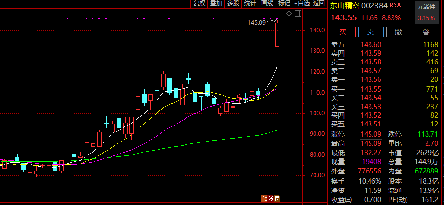 截至4月12日,东山精密最新股价为143.55元/股,总市值2629亿元。