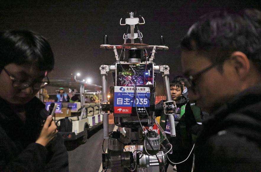 4月12日凌晨,参加2026北京亦庄人形机器人半程马拉松的部分机器人跑者完成赛前全流程全要素测试。