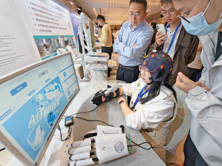 4月11日,全国脑机接口临床应用与转化大会,参会者现场体验植入式脑机接口医疗系统。新京报记者陶冉摄
