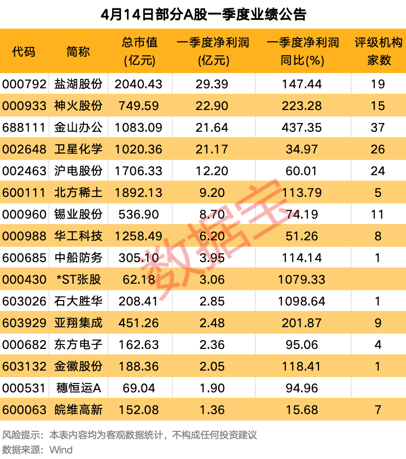人民财讯4月14日电,据证券时报·数据宝统计,4月14日,共计29家上市公司发布2026年一季度业绩相关公告,多家行业龙头公司在列。从净利润规模来看,16家净利润在1亿元以上,盐湖股份、神火股份、金山办公、卫星化学等四家公司均超过20亿元;沪电股份超过10亿元。从净利润变动来看,金山办公同比增幅居首,高达437.35%;神火股份、亚翔集成增幅超过200%;盐湖股份、金徽股份、中船防务、北方稀土等紧随其后,一季度业绩均实现同比翻倍增长。