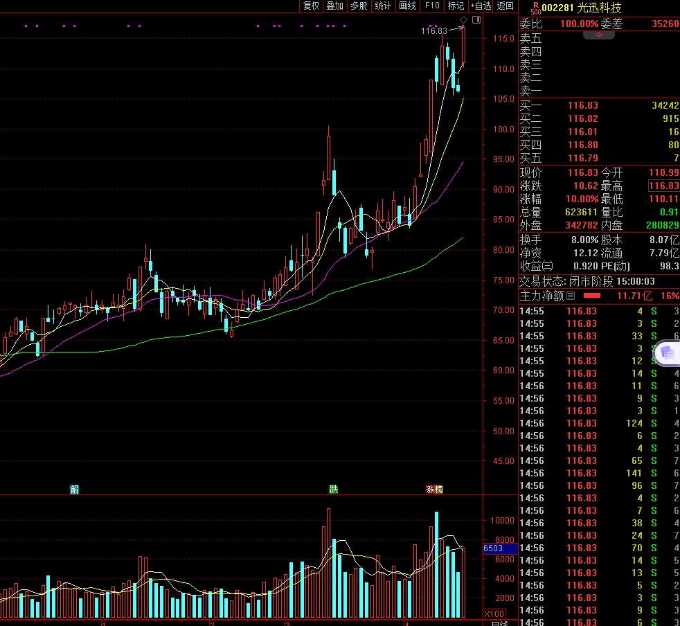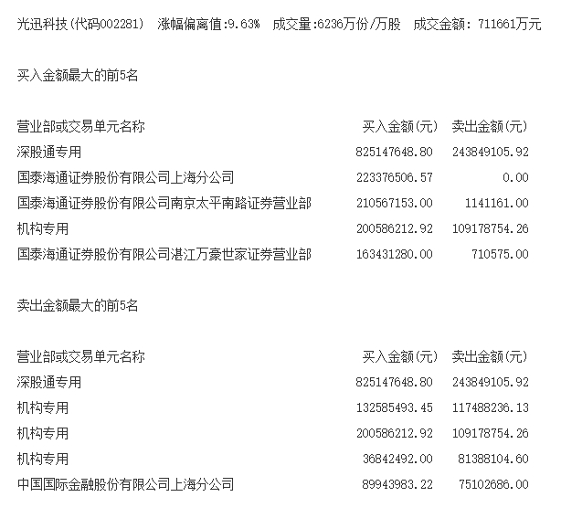 人民财讯4月17日电,CPO概念股光迅科技4月17日涨停,股价创历史新高,全天成交金额71亿元。盘后数据显示,两家活跃游资买入。国泰海通证券南京太平南路证券营业部买入2.11亿元,卖出114万元;国泰海通证券湛江万豪世家证券营业部买入1.63亿元,卖出71万元。