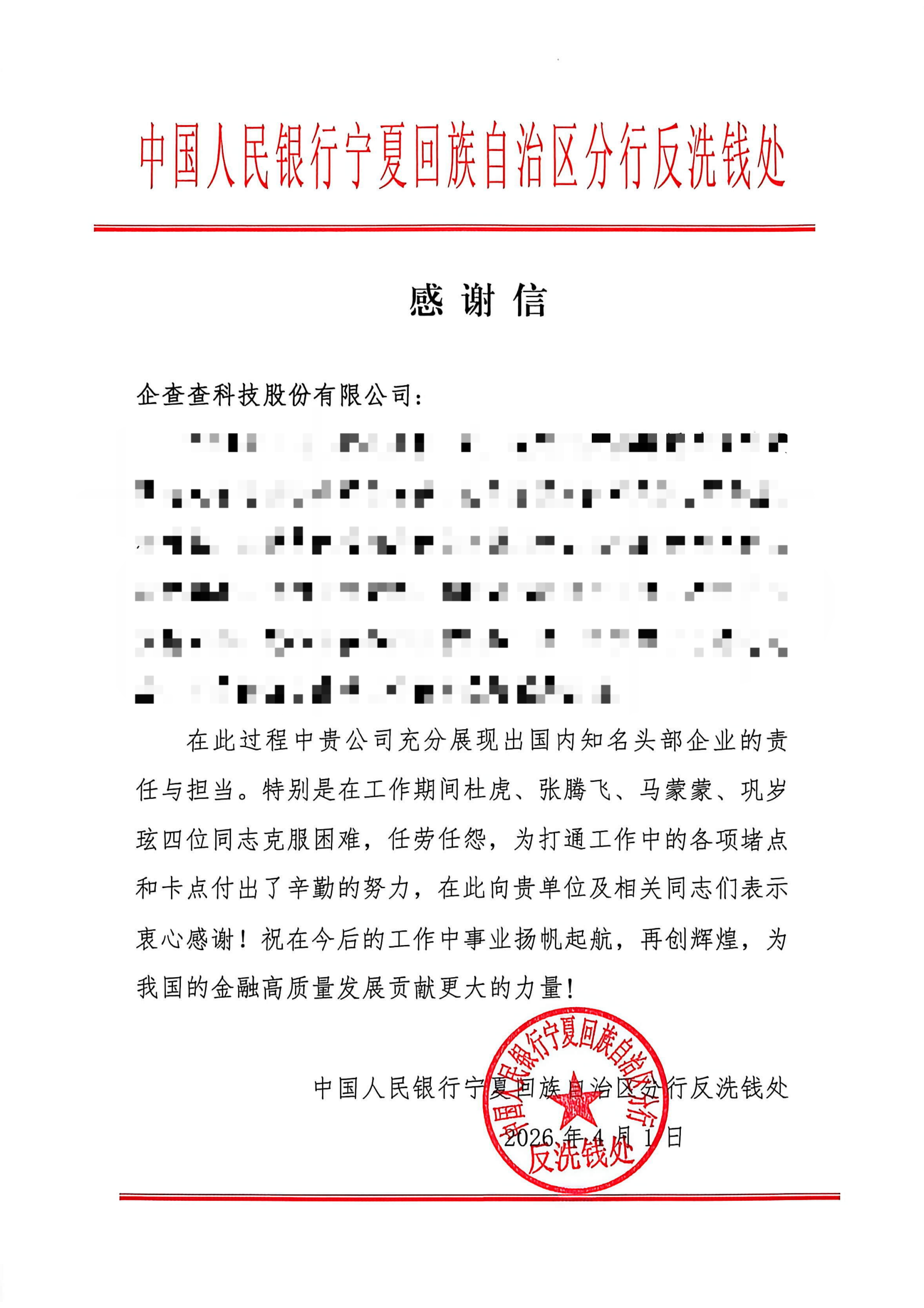 近日,企查查收到中国人民银行宁夏回族自治区分行反洗钱处发来的感谢信,对其在一项紧急任务中凭借科技实力提供的鼎力支持表示衷心感谢。信中指出,企查查在任务中充分展现出国内知名头部企业的责任与担当,其AI技术赋能下的服务能力,有力保障了工作任务的圆满完成。作为国内领先的企业信用信息查询平台,企查查将AI算法深度融入多维数据分析体系,通过智能建模、风险识别、股权穿透等核心技术,构建起高效的科技反诈支撑体系,已成为助力各地反诈、反洗钱工作的重要技术力量,在全国范围内形成了多个可复制、可推广的科技反诈应用案例。