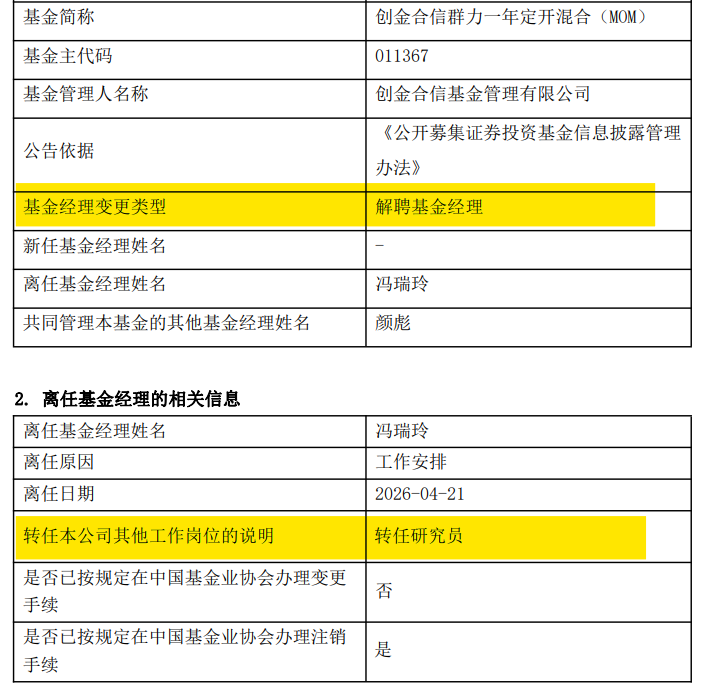 4月21日,创金合信基金发布公告称,创金合信群力一年定开混合(MOM)基金经理冯瑞玲离任,转任研究员。根据公告,此次离任原因为工作安排,离任时间为4月21日。该产品目前由共管基金经理颜彪负责管理。