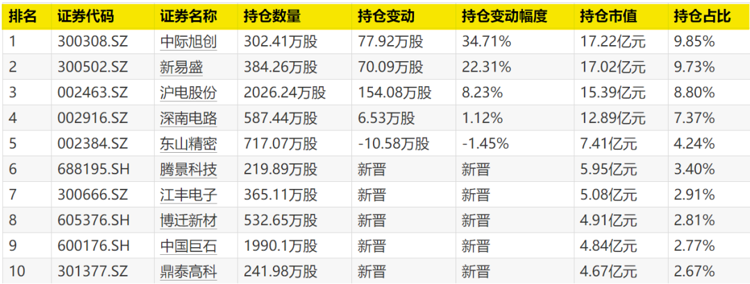 与上季度相比,生益电子、中际旭创、新易盛获不同程度加仓,加仓幅度分别为37.45%、15.83%、4.90%,持仓市值同样均超3亿元。
