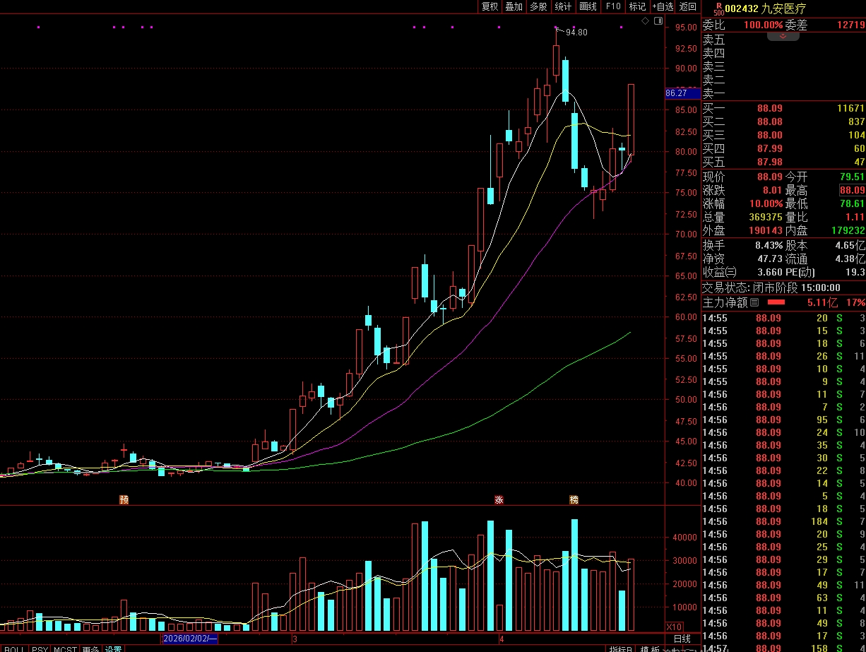 人民财讯4月22日电,4月22日,九安医疗尾盘涨停,全天成交金额30.6亿元。盘后龙虎榜数据显示,活跃游资国泰海通证券武汉紫阳东路证券营业部买入1.57亿元,卖出15万元。深股通专用席位买入2.06亿元,卖出2.33亿元。此外,买卖方面均有多家机构。
