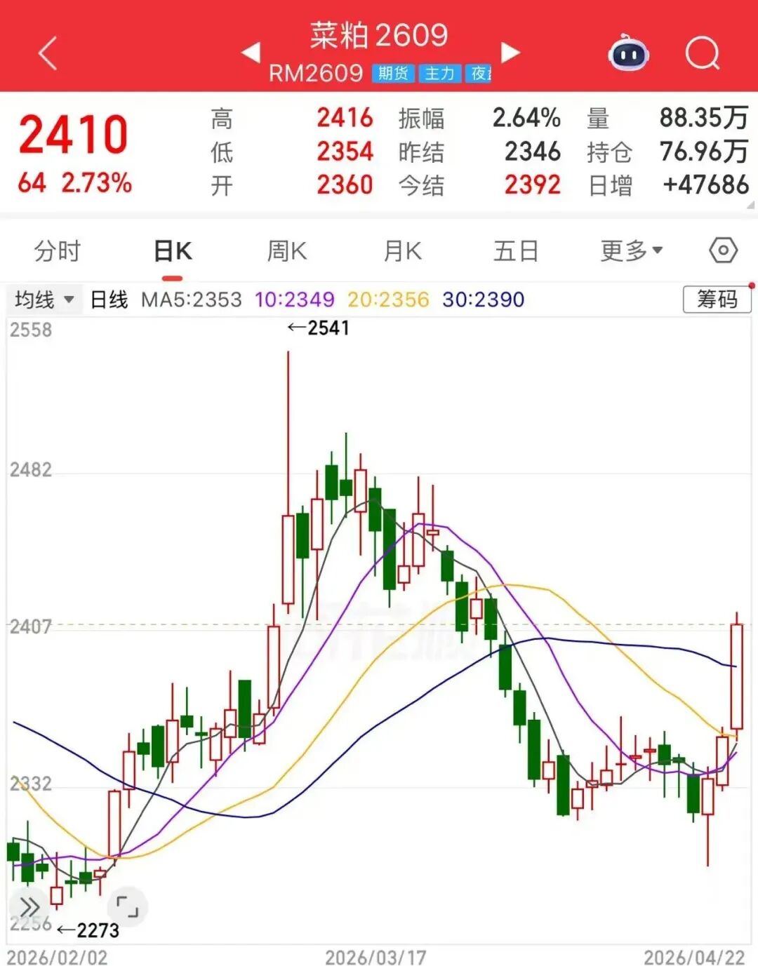 本周,菜粕期货价格显著回升。4月22日,菜粕期货主力合约收报2410元/吨,上涨2.73%。有交易者提问:市场基本面是否发生了变化?
