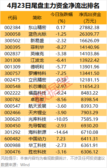尾盘主力资金净流出方面,东山精密、蓝色光标尾盘主力资金净流出均超2亿元,新易盛、菲利华、英维克、江波龙等尾盘主力资金净流出金额均超1亿元。