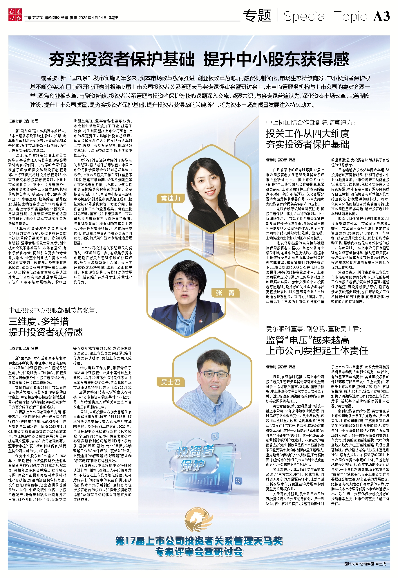 编者按:新 “国九条” 发布实施两年多来,资本市场改革纵深推进,创业板改革落地、再融资机制优化,市场生态持续向好,中小投资者保护根基不断夯实。在日前召开的证券时报第17届上市公司投资者关系管理天马奖专家评审会暨研讨会上,来自监管服务机构与上市公司的嘉宾齐聚一堂,聚焦创业板改革、再融资新政、投资者关系管理与投资者保护等核心议题深入交流、凝聚共识。与会专家普遍认为,深化资本市场改革、完善制度建设、提升上市公司质量,是夯实投资者保护基础、提升投资者获得感的关键所在,将为资本市场高质量发展注入持久动力。