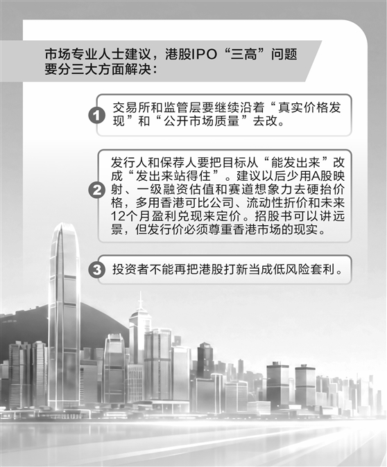 汇生国际资本总裁黄立冲告诉证券时报记者,港股IPO“三高”问题要分三大方面解决。一是交易所和监管层要继续沿着“真实价格发现”和“公开市场质量”去改。
