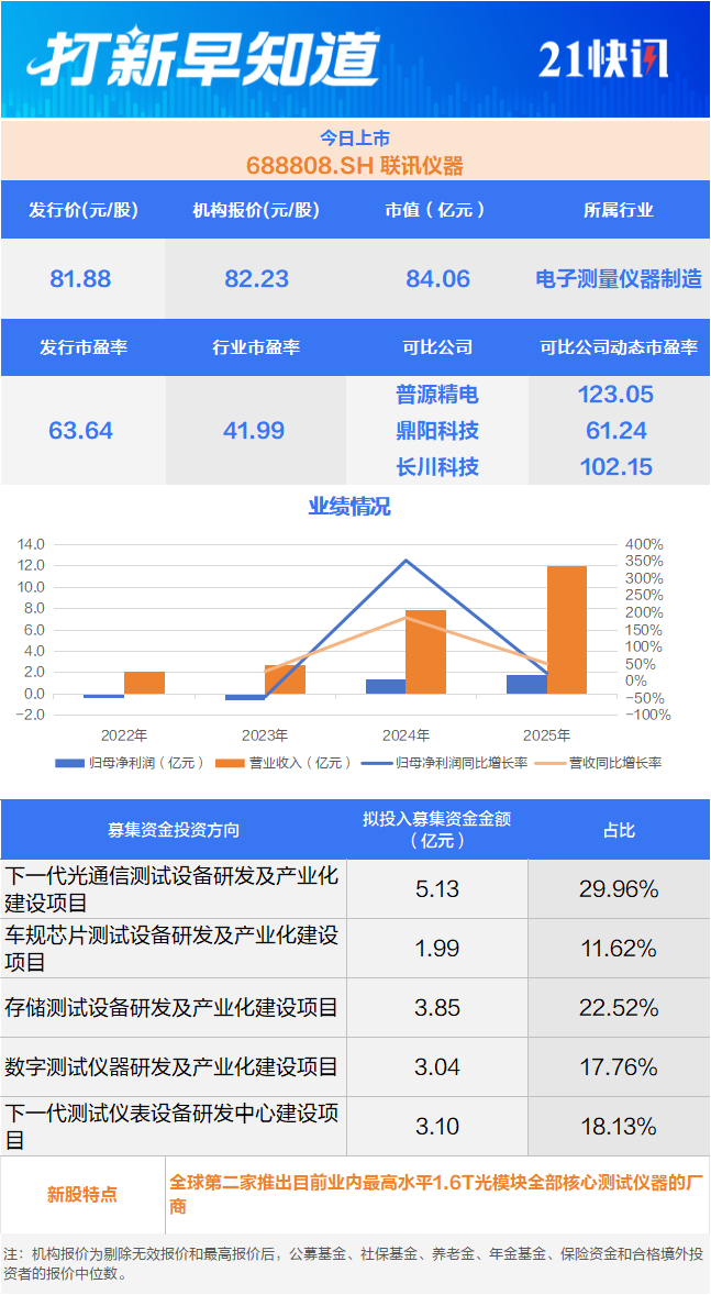 技术方面,联讯仪器是业内极少数覆盖光通信产业链中模块、芯片、晶圆等核心环节测试需求的厂商,全球少数、国内极少数量产供货400G、800G、1.6T高速光模块核心测试仪器的厂商,全球第二家推出目前业内最高水平1.6T光模块全部核心测试仪器的厂商;国内极少数可提供PXIe插卡式源表、低漏电开关矩阵、高压源表、脉冲源等多产品矩阵的电性能测试仪器厂商;国内极少数同时实现晶圆级老化测试设备、裸芯片级分选测试设备产业化应用的厂商,国内少数具备精密源表等核心测试部件自主能力的半导体测试设备厂商,产品核心性能指标业内领先。
