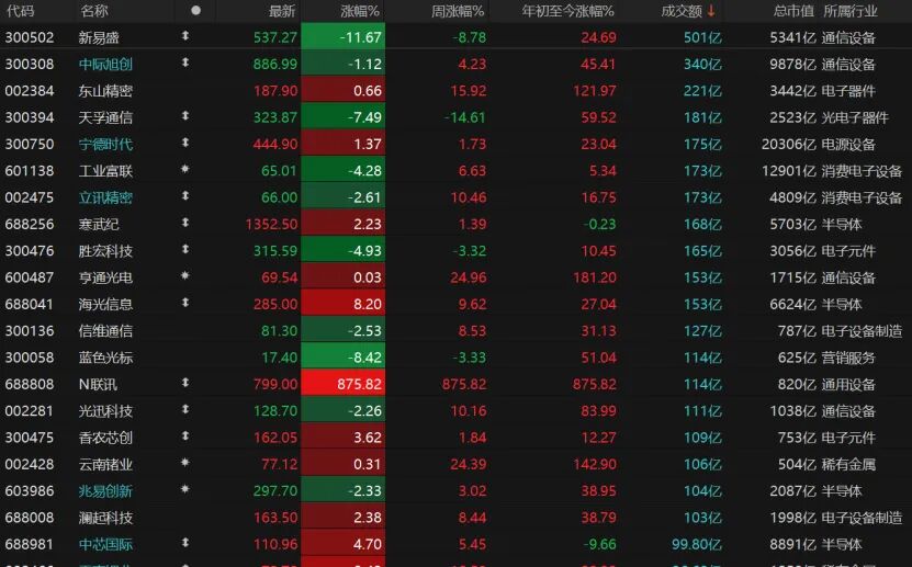 个股跌多涨少,共计3352只个股收跌,跌停股37只;2036只个股收涨,涨停股68只。19只个股日成交额超过100亿元,新易盛收跌11.67%报537.27元/股,中际旭创收跌1.12%报886.99元/股,天孚通信收跌7.49%报323.87元/股。N联讯收涨875.82%报799元/股,海光信息收涨8.2%报285元/股。