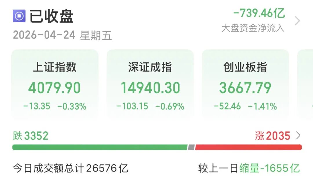 4月24日,A股缩量下跌,量能仍在2.6万亿元上方,3352只个股收跌,通信、传媒、军工等板块领跌,有色、化工等板块领涨。