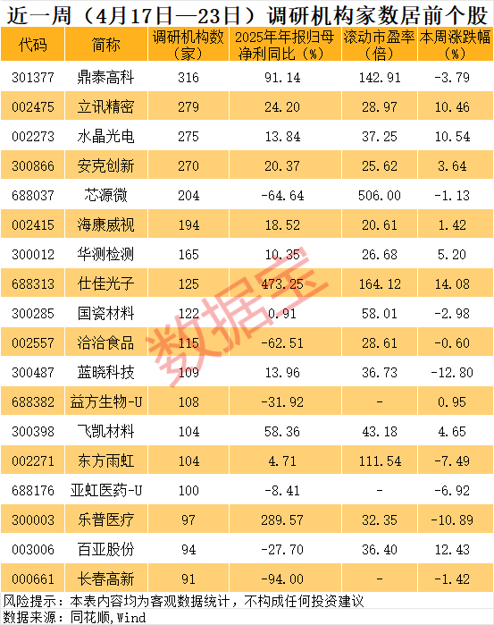 人民财讯4月26日电,近一周机构调研个股有350多只,鼎泰高科调研机构数最多。鼎泰高科有316家机构调研,包括72家基金公司、40家证券公司、31家私募、20家保险公司等。鼎泰高科是本轮行情最大牛股之一,2024年低点以来最大涨幅超过20倍。立讯精密、水晶光电、安克创新、芯源微等10多只个股也获得超百家机构调研。从市场表现来看,近一周机构调研股平均下跌0.08%,金富科技、金宏气体、永鼎股份等个股均涨超15%。