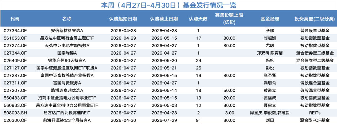 FOF方面,前海开源裕安3个月持有为混合型FOF,认购天数为91天,并设置了80亿份的认购上限。