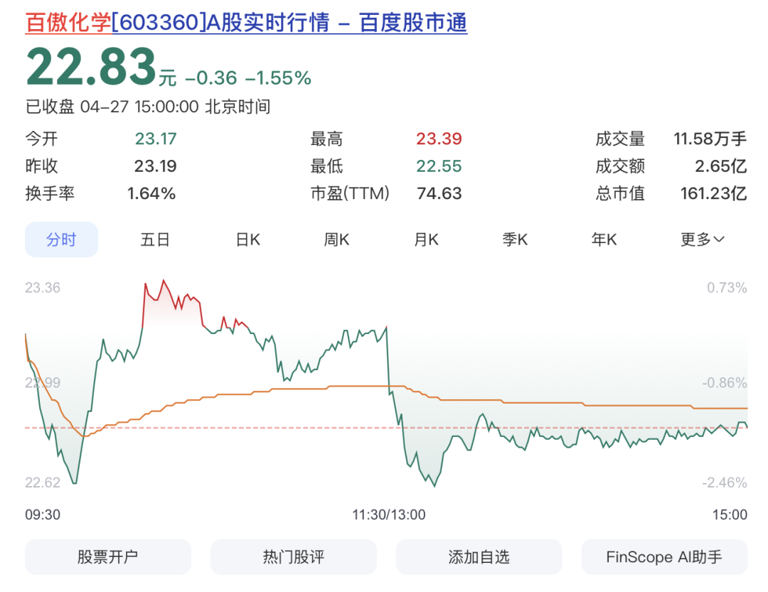 截至最新,百傲化学股价报22.83元/股,总市值161.23亿元。