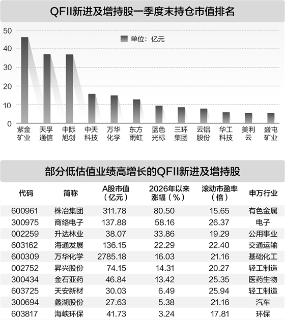 从持仓变动来看,与上个季度末相比,今年一季度期间QFII新进及增持的股票有443只。这443只股票中,一季度末QFII持仓市值规模超10亿元的有6只,分别为紫金矿业、天孚通信、中际旭创、中天科技、万华化学、东方雨虹,这6只股票均为细分行业龙头股。