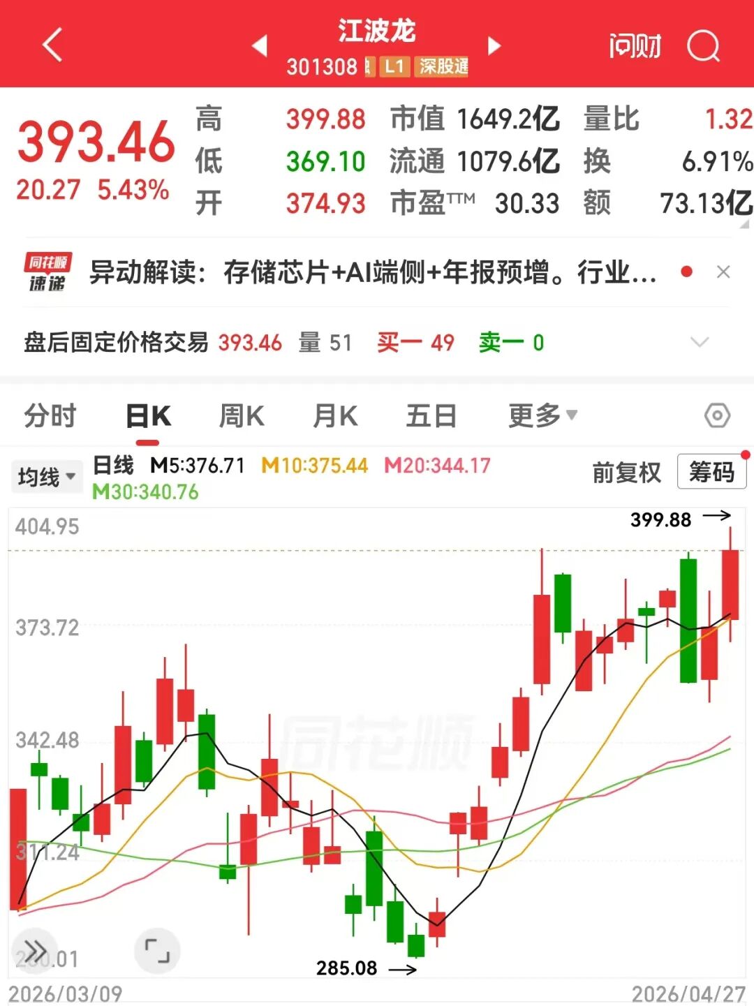 4月27日,公司盘中股价创下新高,最新报393.46元/股,总市值1649.2亿元。