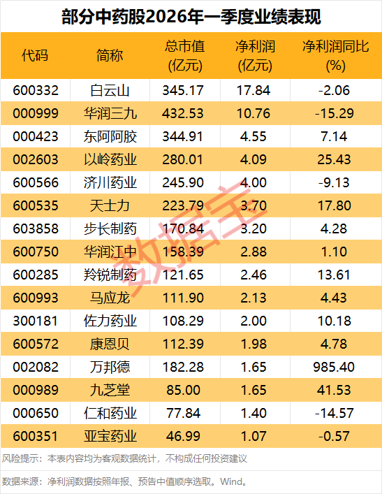 据证券时报·数据宝统计(数据按照年报、快报、预告中值顺序选取),截至4月28日,已有36只中药股发布2026年一季度业绩相关报告。其中,16股盈利超过1亿元,白云山、华润三九暂列第一、第二位,净利润分别为17.84亿元、10.76亿元;东阿阿胶、以岭药业、济川药业、天士力、步长制药紧随其后,净利润均在3亿元以上。