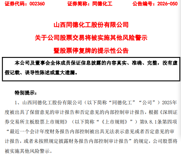 同德化工(002360)4月27日晚间公告,由于被出具了保留意见的审计报告和否定意见的内部控制审计报告,公司股票将自2026年4月29日开市起被实施其他风险警示,股票简称由“同德化工”变更为“ST同德”。另外,公司及相关责任人收到山西证监局行政监管措施决定书。