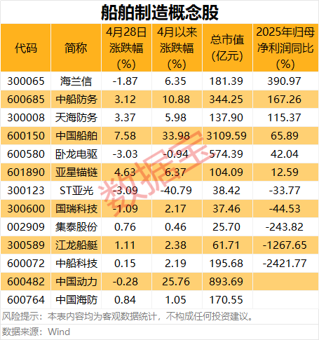 据证券时报·数据宝统计,A股中布局船舶制造的个股共有13只,其中11股公布2025年度业绩相关公告,净利润按年报、业绩快报、业绩预告下限计算,6股归母净利润实现同比增长,海兰信、中船防务、天海防务增幅超过100%。