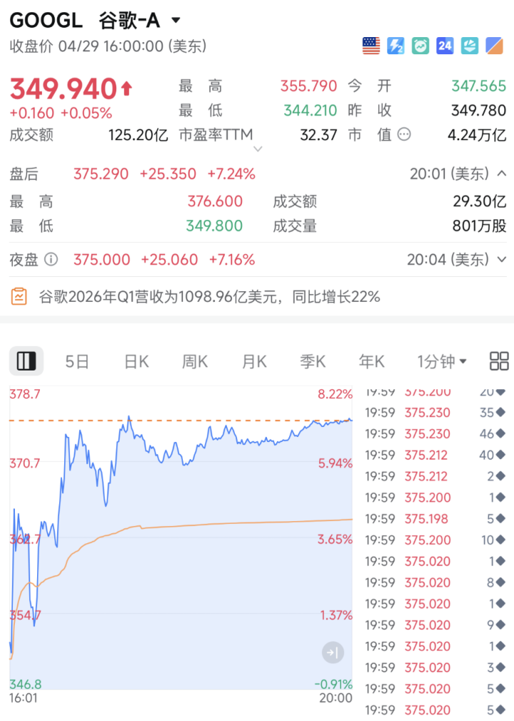 美东时间4月29日,在美股盘后交易中,谷歌股价直线拉升,大涨7.24%。