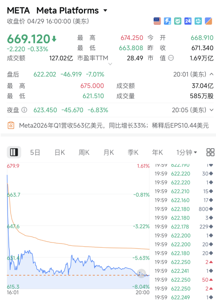 在发布财报后,Meta股价直线跳水,盘后大跌7.01%。