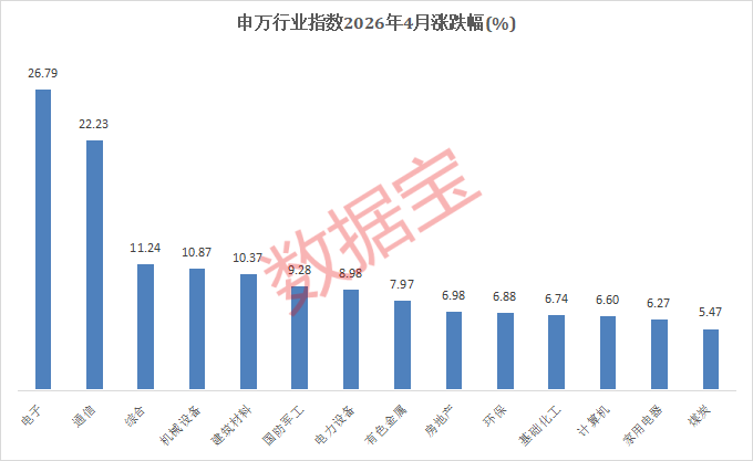 以申万一级行业划分,电子、通信指数月涨幅居前,分别为26.79%、22.23%;综合、机械设备、建筑材料指数紧随其后,月涨幅均在10%以上。银行、交通运输、食品饮料则是为数不多录得跌幅的申万行业指数,食品饮料下跌1.12%,银行、交通运输跌幅不足1%。