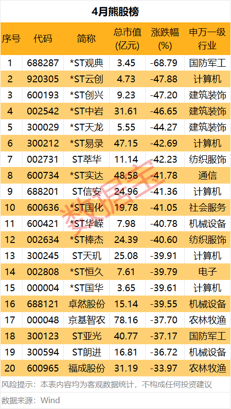 熊股方面,4月共计27股股价跌幅超过30%。*ST观典跌幅居首,股价月内大跌68.79%。在非退市股、非ST个股中,卓然股份跌幅居首,月跌幅达到39.55%;京基智农、福成股份两只农林牧渔股紧随其后,月跌幅分别为37.7%、33.97%。