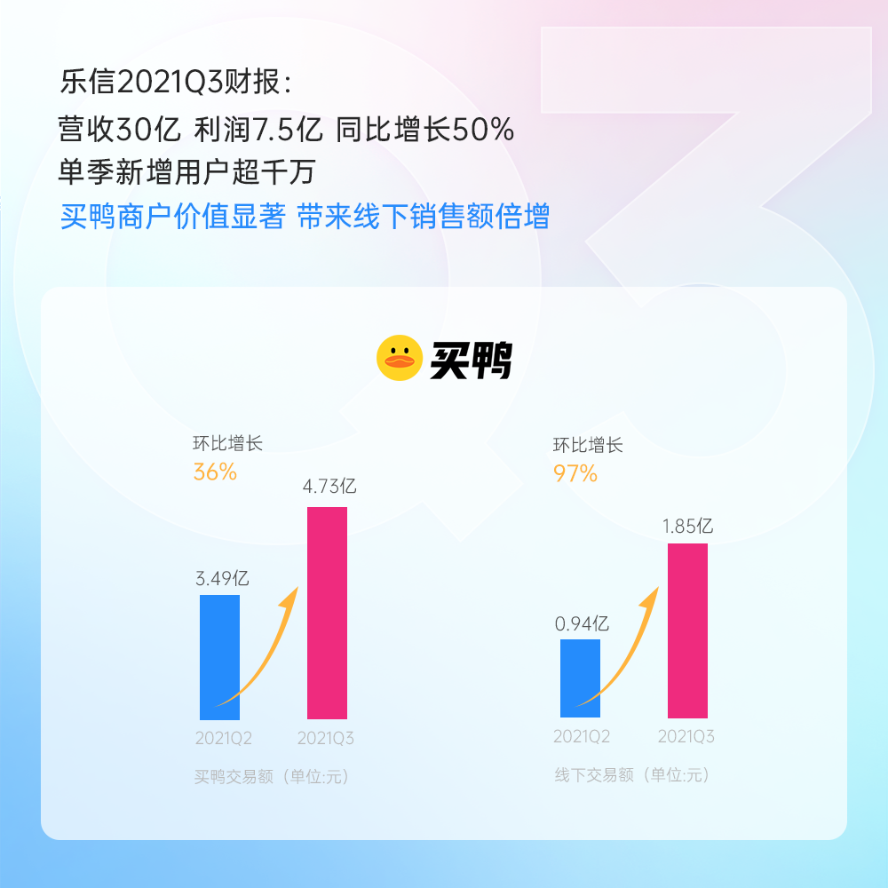 3季度,乐信先享后付产品买鸭已在多个知名品牌和购物中心开启试点合作,并实现交易额4.73亿元,服务用户60万。其中,线下销售额1.85 亿元,环比2季度翻倍增长,占销售额比重由27%上升至39%;线下用户数环比2季度增长126%,占比从6.3%提高到14.7%。