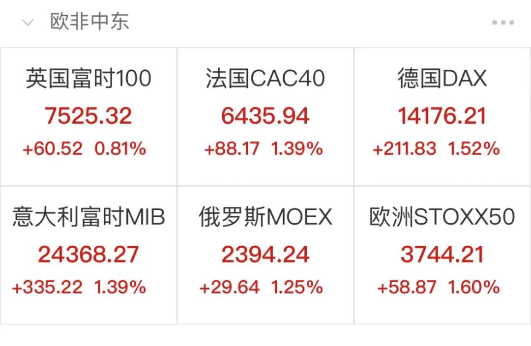外围市场方面,欧股全线高开,截至发稿,英国富时100指数涨0.81%,法国CAC40指数涨1.39%,德国DAX指数涨1.52%,意大利富时MIB指数涨1.39%。