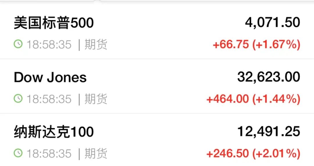 美股指数期货持续走高,截至发稿,标普500指数期货、道指指数期货均涨超1%,纳斯达克100指数期货涨超2%。