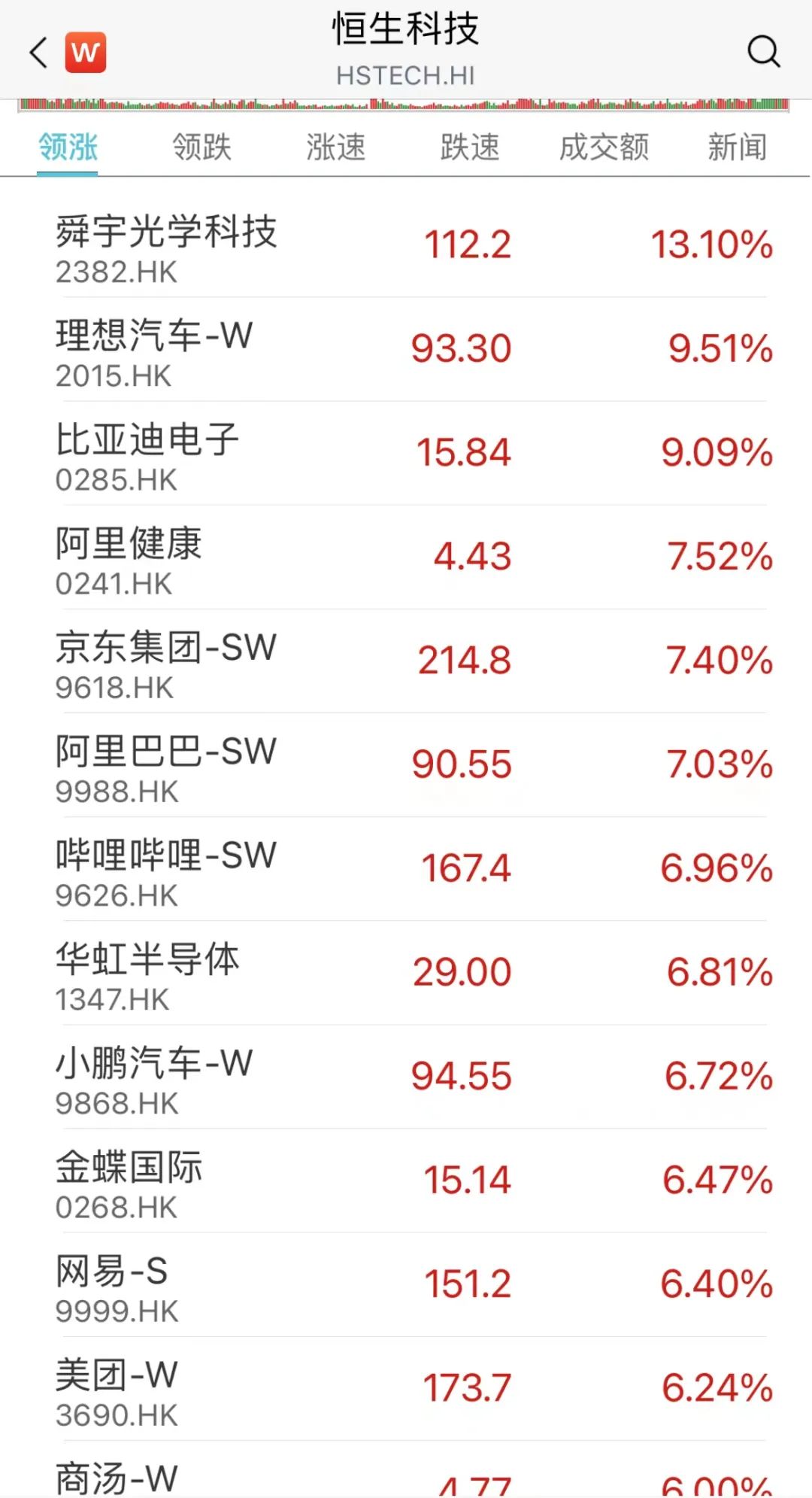 事实上,今日已收盘港股科技股的表现颇为亮眼,截至收盘,香港恒生指数收涨3.27%,恒生科技指数大涨5.78%,舜宇光学科技涨超13%,比亚迪电子、理想汽车涨超9%,京东、阿里巴巴涨超7%,哔哩哔哩、网易涨超6%。