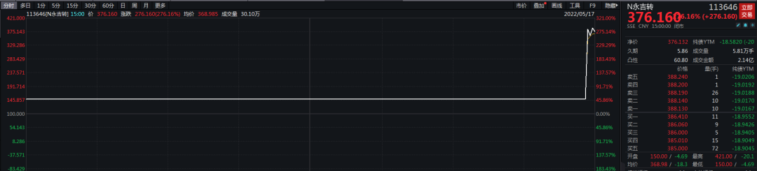 下午2点57分,永吉转债复牌后直线暴拉,价格瞬间达到了300元之上,最高冲至421元,以此计算,中一签该可转债的投资者收益可达到3210元。随后,永吉转债价格有所回落,截至收盘,永吉转债报收376.16元,涨幅达276.16%。即便以收盘价计算,中一签永吉转债的投资者仍可获利2761.60元。此收益堪比部分新股。