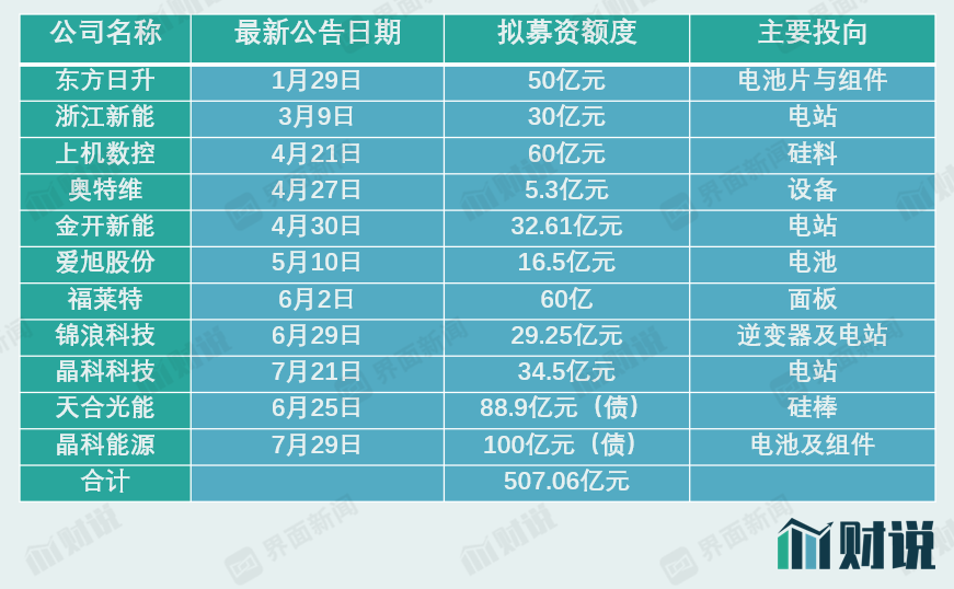 随着晶科能源(688223.SH)100亿可转换债券预案公告发布,新一轮光伏扩产拉开了序幕。据界面新闻不完全统计,今年以来有至少11家光伏企业拟通过定增或可转债的形式募集资金扩大产能,合计拟募资额为507.06亿元。光伏行业的热度可见一斑。
