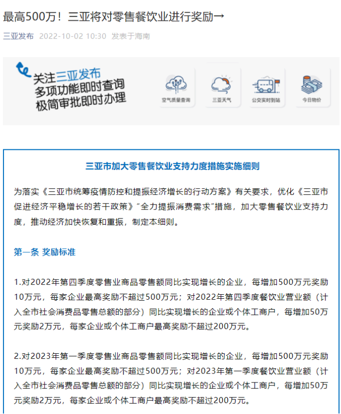 其中,《三亚市加大零售餐饮业支持力度措施实施细则》提出,对2022年第四季度、2023年第一季度,零售业商品零售额同比实现增长的企业,每增加500万元奖励10万元,每家企业最高奖励不超过500万元;餐饮业营业额(计入全市社会消费品零售总额的部分)同比实现增长的企业或个体工商户,每增加50万元奖励2万元,每家企业或个体工商户最高奖励不超过200万元。