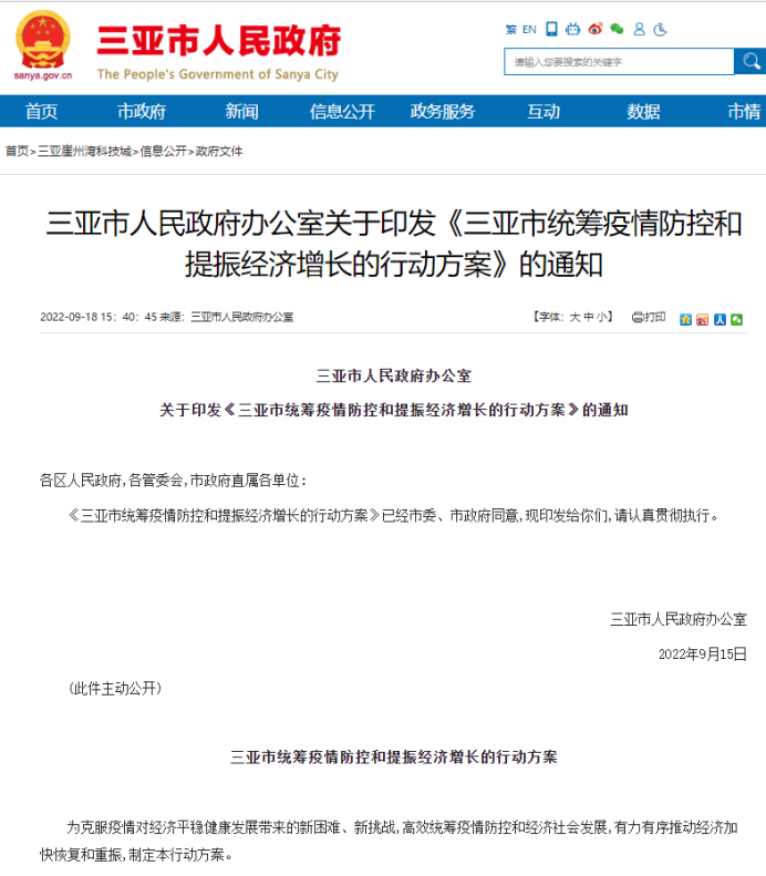 稍早的9月17日,为克服疫情对经济平稳健康发展带来的新困难、新挑战,高效统筹疫情防控和经济社会发展,有力有序推动经济加快恢复和重振,三亚市人民政府办公室制定印发《三亚市统筹疫情防控和提振经济增长的行动方案》,第一阶段有序推动复工复产。精准实施分区分级差异化防控策略,强化复工复产疫情防控保障,扩大企业防疫和消杀补贴范围。同时,更大力度助企纾困解难,进一步降低用水用电用气成本,扩大租金减免范围,加大政府采购支持中小企业力度,更大力度加强民生保障。