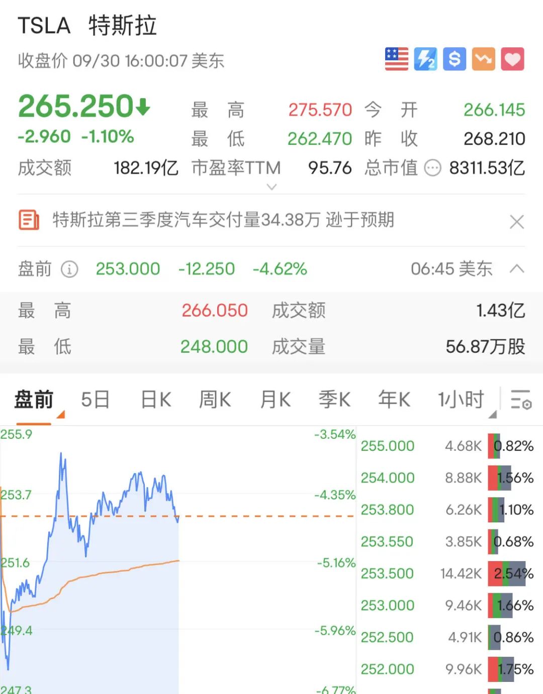 值得一提的是,特斯拉第三季度交付量并不及分析师此前预期的35.79万辆。受此影响,美股盘前,特斯拉股价跌幅超4%。