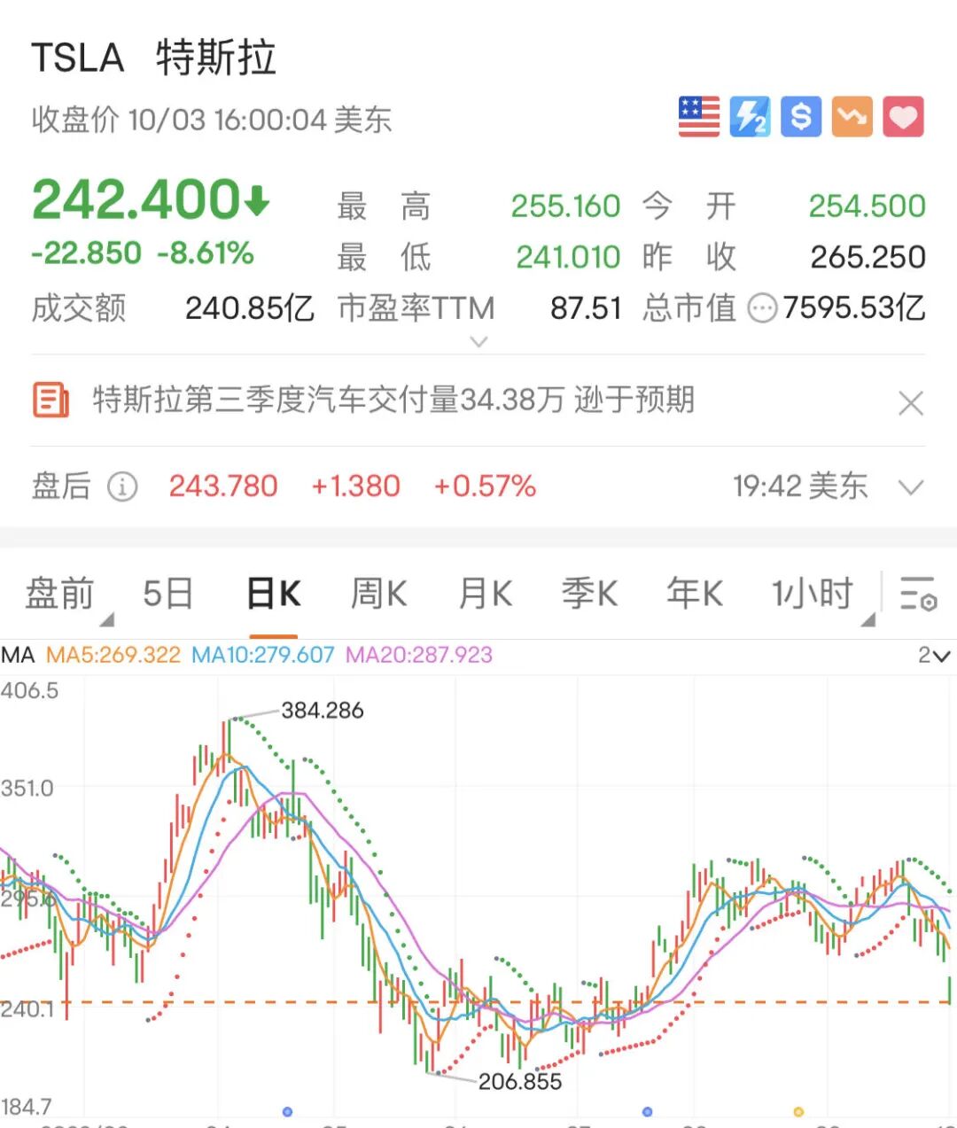 10月3日美股新能源汽车股走弱,特斯拉三季度汽车交付量未达市场预期,10月3日特斯拉股价大跌8.61%,为4个月来最大单日跌幅,最新报242.4美元。