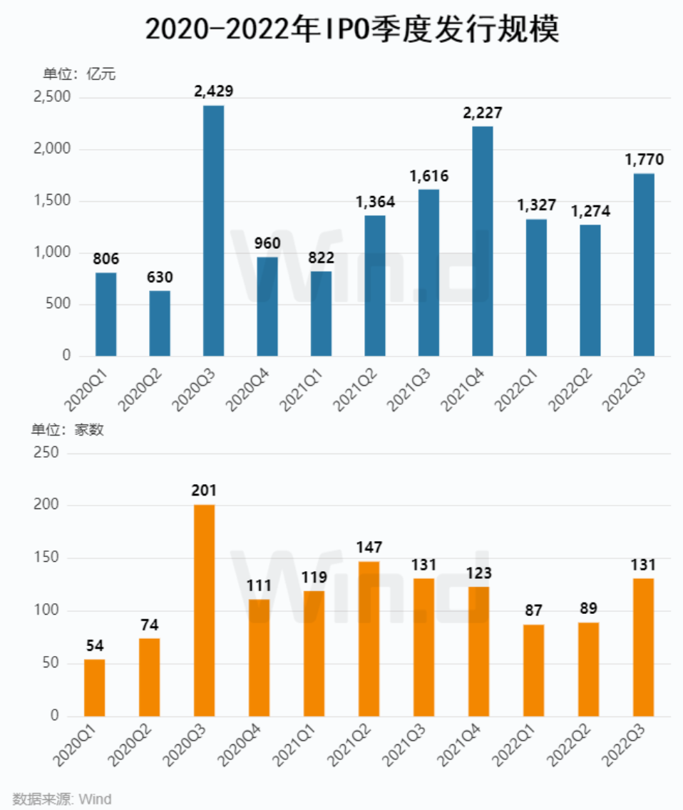 具体来看,今年前三季度,A股IPO项目家数为307起,同比减少90起;募集金额为4370亿元,同比上升15%。其中,第三季度IPO项目家数131起,与去年同期持平,环期增加42起;募集金额为1770亿元,环比上升39%,表明第三季度IPO发行环比回暖明显。
