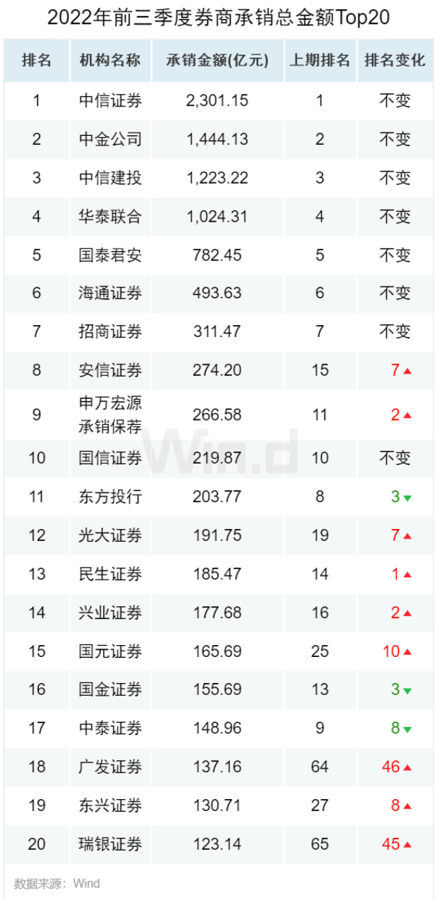 再融资领域,今年前三季度,中金公司和中信证券承销的增发规模分别为893亿元和743亿元,紧随其后的依次是华泰联合证券、中信建投证券和国泰君安证券,分别为589亿元、449亿元和410亿元。