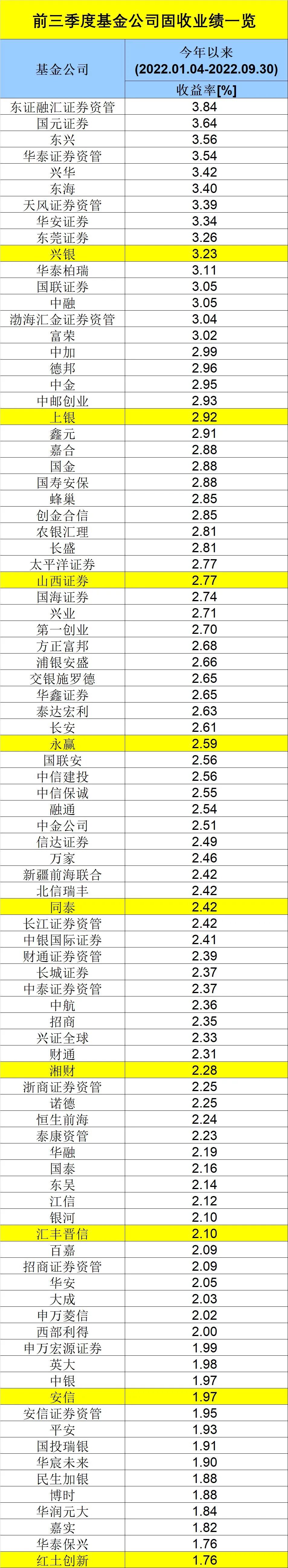 数据显示,其中15家管理人净值增长率超3%。前三季度固收业绩表现较好的是东证融汇证券资管、国元证券、东兴、华泰证券资管,收益率分别为3.84%、3.64%、3.56%、3.54%。此外,兴华、东海、天风证券资管、华安证券、东莞证券、兴银基金等表现较好。