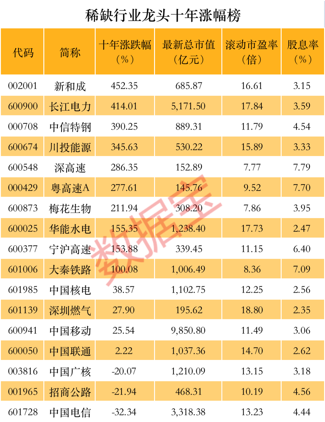 榜单中个股稀缺性较为明显,比如三大运营商、多只水电行业龙头标的、核电行业龙头、高速公路龙头、铁路运输龙头等。此外,榜单中还有中信特钢、新和成、梅花生物等在细分领域具备较高市占率的龙头企业。