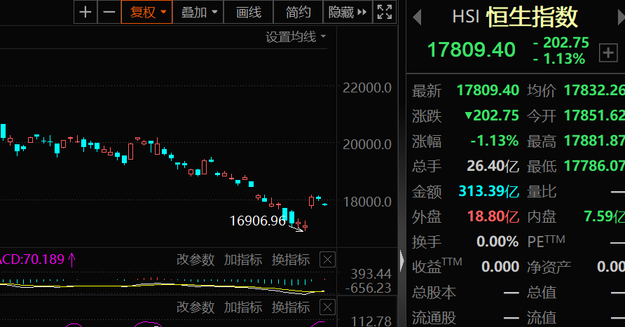 隔夜美股三大指数集体收跌。受此影响,早盘港股低开后延续调整,恒指早盘再度失守18000点,截至午间收盘,恒生指数跌1.13%,报17809.4点;恒生科技指数跌2.8%。