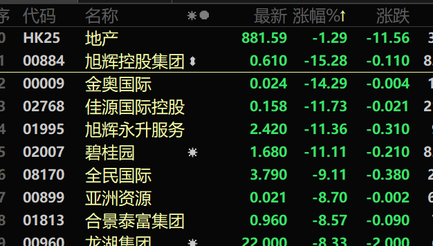 房地产板块继续承压,旭辉控股领跌地产,跌幅15.28%,碧桂园大跌11.11%。