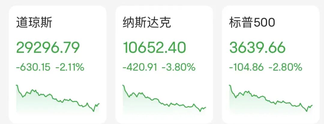 周五美股低开低走,三大指数均大跌,截至收盘,道琼斯指数跌2.11%,标普500指数跌2.80%,纳斯达克指数跌3.80%。