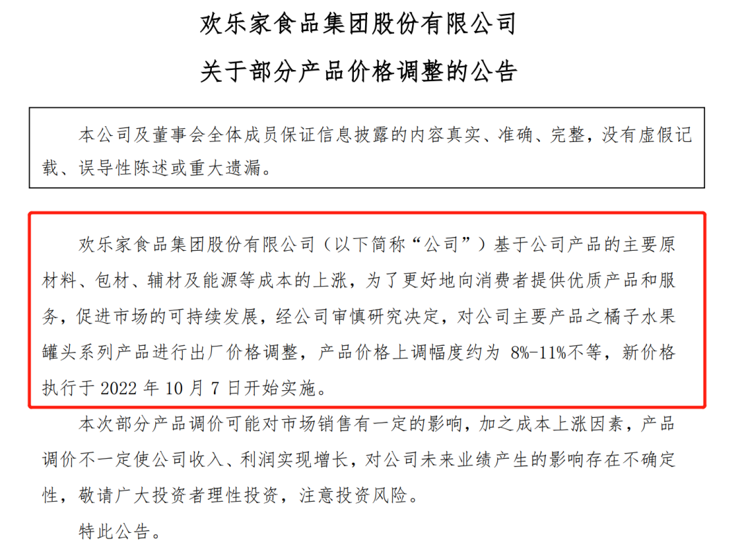 10月10日晚间,欢乐家公告,基于公司产品的主要原材料、包材、辅材及能源等成本的上涨,经公司审慎研究决定,对公司主要产品之橘子水果罐头系列产品进行出厂价格调整,产品价格上调幅度约为8%-11%不等,新价格执行于2022年10月7日开始实施。