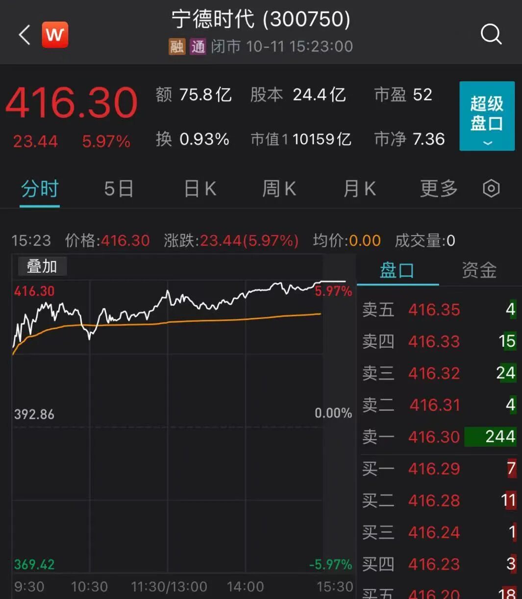 锂电池概念盘中强势拉升,截至收盘,天赐材料、金石资源、圣阳股份涨停,亿纬锂能涨逾6%;宁德时代涨5.97%报416.3元,最新市值10160亿元。
